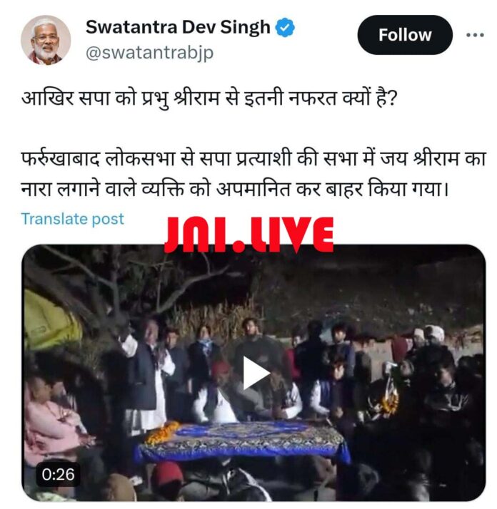 फर्रुखाबाद:(जेएनआई ब्यूरो) बीते दिनों ही सपा के लोकसभा प्रत्याशी घोषित किये गये डॉ. नबल किशोर शाक्य की सभा में जय श्रीराम का नारा लगानें वाले युवक को बाहर निकाल दिया गया | वीडियो वायरल होनें के बाद मामला सोशल मीडिया पर गर्म है | भाजपा के बड़े नेताओं नें उसे अपने सोशल मीडिया एकाउंट पर शेयर भी किया है|
