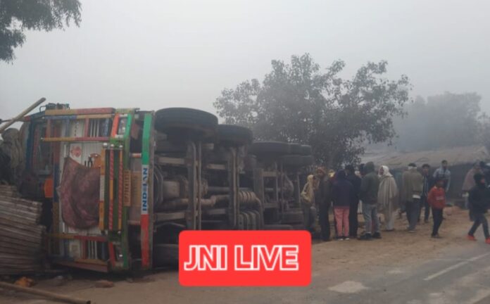 ड्राइवर को झपकी आने से धान भरा ट्रक पलटा, आधा दर्जन दुकानों के खोखे क्षतिग्रस्त