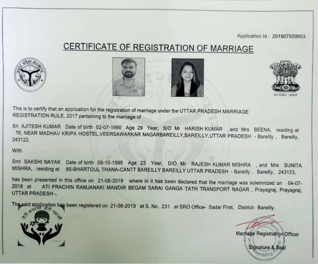 इलाहाबाद हाई कोर्ट ने साक्षी और अजितेश की शादी को वैध मानते हुए दोनों को दो महीने के भीतर शादी का रजिस्ट्रेशन करवाने का निर्देश दिया था। बुधवार को पुलिस दोनों को कड़े सुरक्षा घेरे में बरेली लेकर आई और रजिस्ट्रार के सामने पेश किया। इस दौरान दोनों को मीडिया से भी दूर रखा गया।