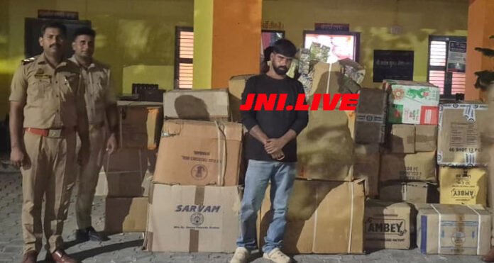 फर्रुखाबाद:(नगर संवाददाता) बिना लाइसेंस आतिशबाजी का भंडारण ट्रांसफोर्ट के भीतर करनें में पुलिस ने माल सहित एक आरोपी को गिरफ्तार किया है|