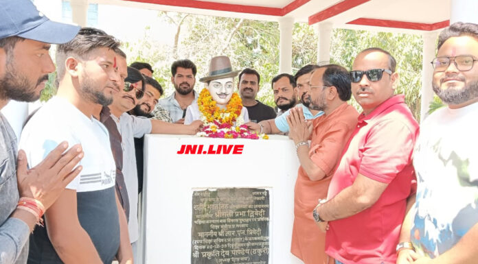 शहर के बद्री विशाल डिग्री कालेज में स्थापित शहीद भगत सिंह की प्रतिमा पर हिन्दू महासभा के युवा प्रदेश अध्यक्ष विमलेश मिश्रा, जिलाध्यक्ष क्रांति पाठक नें संगठन के पदाधिकारियों के साथ श्रद्धांजलि अर्पित की | युवा प्रदेश अध्यक्ष विमलेश मिश्रा नें कहा कि 23 मार्च 1931 को भगत सिंह, राजगुरु और सुखदेव को अंग्रेजों ने फांसी दी थी। हालांकि उन्हें फांसी देने की तारीख एक दिन बाद की थी लेकिन अंग्रेजी हुकूमत देशवासियों के आक्रोश से खौफजदा थी, इसलिए चुपके से एक रात पहले ही उन्हें फांसी के फंदे से लटका दिया गया। देश के वीर सपूतों ने भी हंसते -हंसते अपनी जान भारत के नान कर दी। उनकी पुण्यतिथि पर शहीदों को नमन किया गया है और श्रद्धांजलि अर्पित की गयी है। सचिन शर्मा, अजय दुवे, सौरभ मिश्रा, भान प्रताप सिंह, राजू यादव, अंकित तिवारी, रोहित दीक्षित, शिवम् मिश्रा रोहित राठौर आदि रहे|