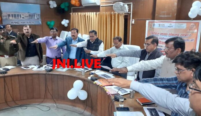 कलेक्ट्रेट सभागार में जिलाधिकारी संजय कुमार सिंह की अध्यक्षता में “विकसित भारत संकल्प यात्रा” के सम्बंध में बैठक हुईं। बैठक मे जिलाधिकारी नें अधिकारियों को शपथ ग्रहण करायी । बैठक बताया गया कि 22 नवंबर 2023 से 26 जनवरी, 2024 तक विकसित भारत संकल्प यात्रा चलायी जाएगी। जिसमें सभी अधिकारियों व कर्मचारियों को पूरी ईमानदारी व लगन के साथ अपनी जिम्मेदारी को निभाकर सफल बनाना है। यात्रा के तहत जनपद की समस्त नगर पालिका, नगर पंचायत, ग्राम पंचायतों के जनसामान्य को प्रमुख जनकल्याणकारी योजनाओं के प्रति जागरूक कर संतृप्त करना है। जिन लाभार्थियों को योजनाओं का लाभ मिला है, उनकी सफलता की कहानियों का भी प्रचार प्रसार करना है। जिन पात्र लाभार्थियों को योजनाओं का लाभ नहीं मिल रहा है उनको चिन्हित करना है। उन्होंने कहा कि केंद्र की ओर से ग्रामीण व शहरी क्षेत्र के लाभार्थियों को आयुष्मान भारत, उज्ज्वला योजना, प्रधानमंत्री विश्वकर्मा योजना, किसान सम्मान निधि, किसान क्रेडिट कार्ड, पोषण अभियान, जलजीवन मिशन, पेंशन व बीमा योजना, सौभाग्य योजना, डिजिटल भुगतान का लाभ पात्रों को दिलाने के लिए संबंधित विभागों के जिम्मेदार पहल करें। सीडीओ अरविन्द कुमार मिश्रा, एडीएम सुभाष चन्द्र प्रजापति, सीएमओ  अवनींद्र कुमार आदि रहे|